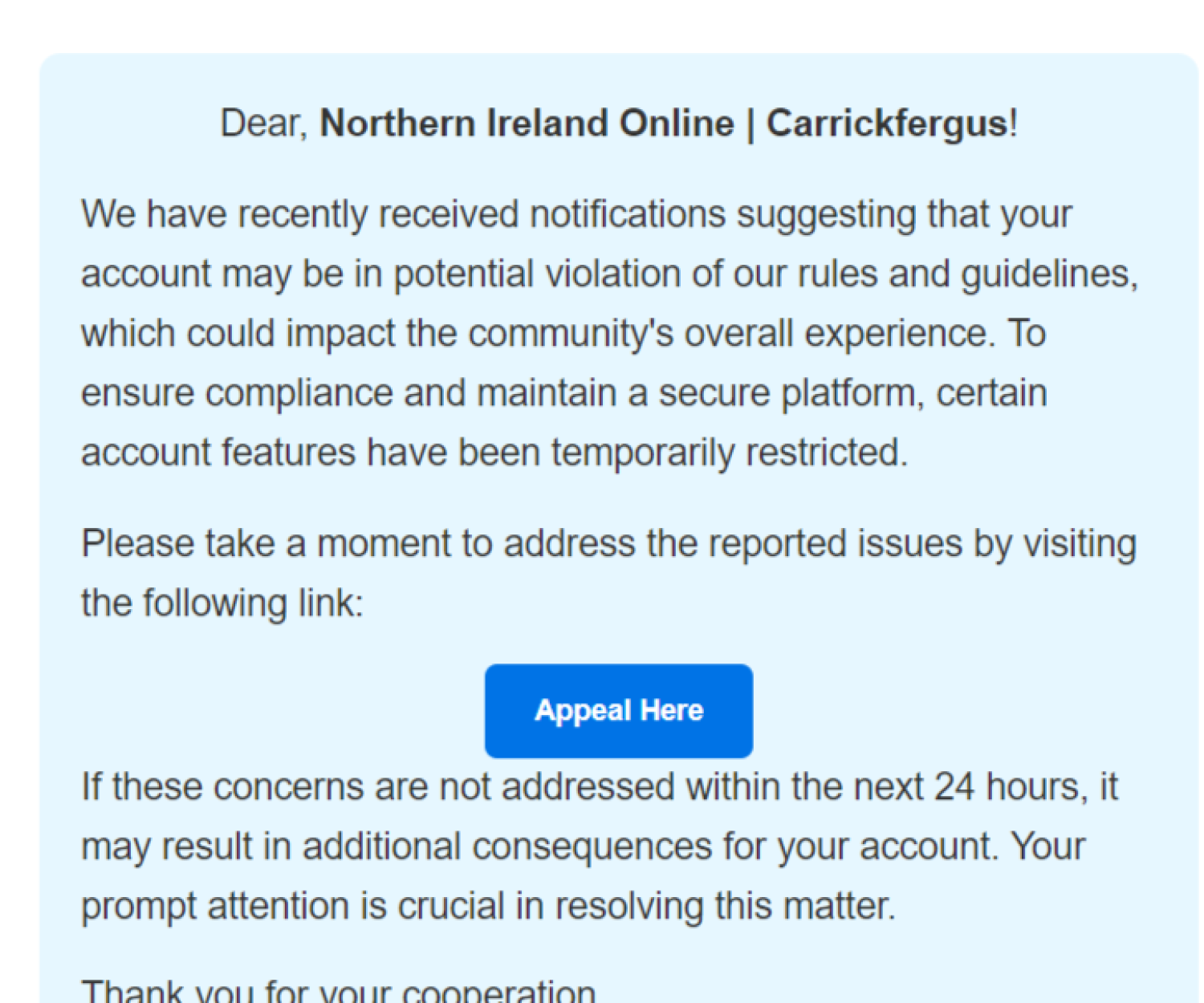 We want to alert you to a growing threat: scam emails claiming that your Facebook page has violated our terms…